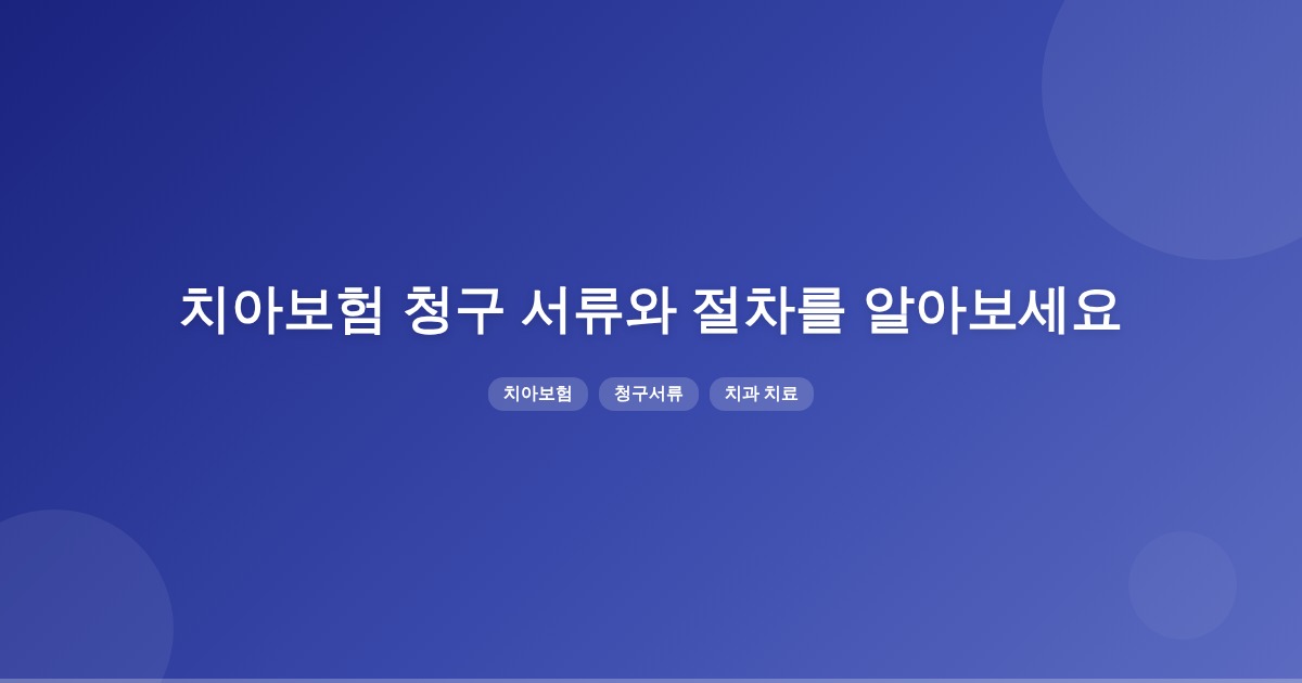 치아보험 청구를 위해서는 진료비 영수증, 진료비 세부내역서, 진단서, X-ray 사진 사본 등이 필요합니다. 청구는 치료일로부터 3년 이내에 진행해야 하며, 미용 목적의 치료는 보상에서 제외됩니다.