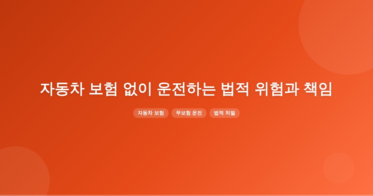 자동차 보험 없이 운전하는 것은 불법이며, 형사처벌과 행정처분을 받을 수 있습니다. 사고 발생 시 모든 피해에 대해 전액 책임을 져야 하므로, 최소한의 책임보험은 필수입니다.