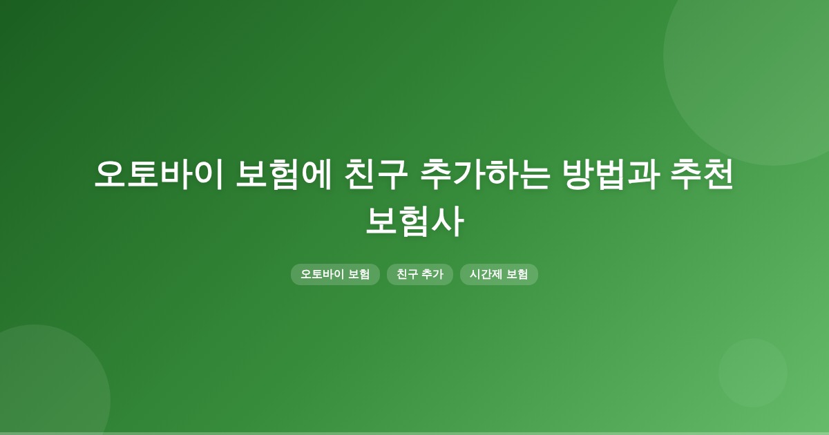 오토바이 보험에 친구를 추가하려면 배달의민족이나 쿠팡이츠의 시간제 보험을 이용할 수 있습니다. 가입 시 본인 인증과 오토바이 등록증, 운전면허증 등의 서류가 필요합니다.