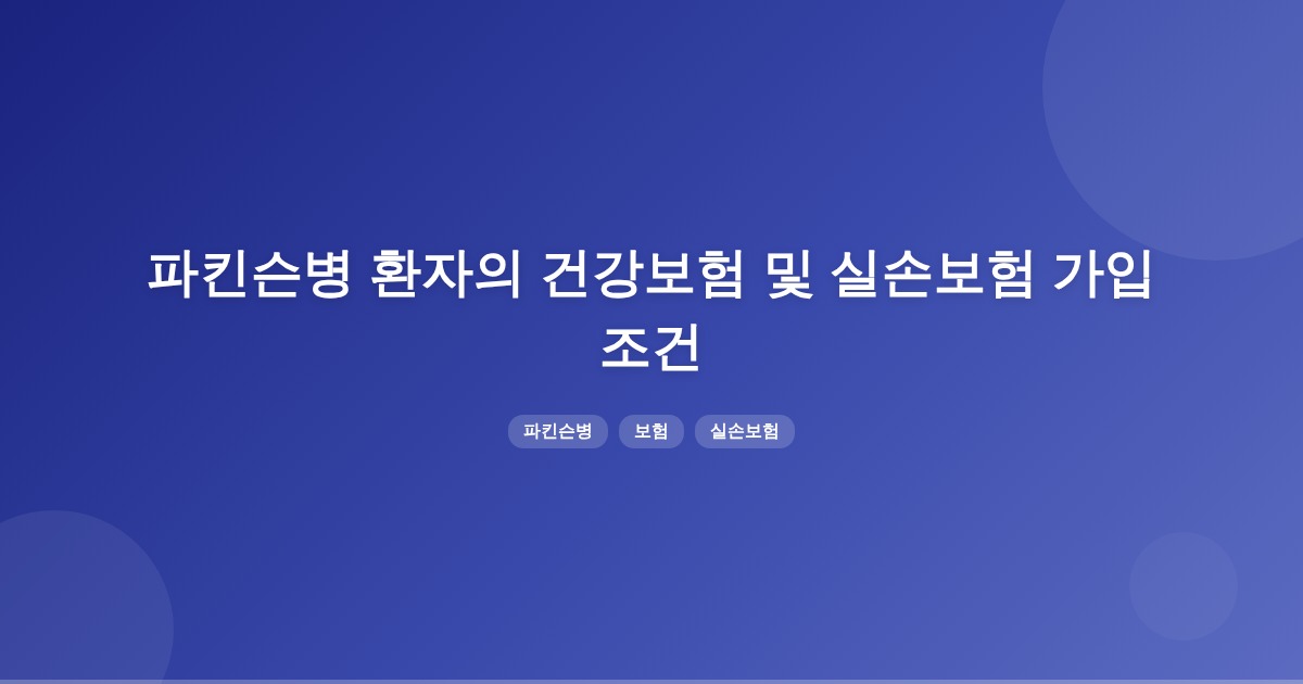 파킨슨병 환자는 건강보험에 가입할 수 있으며, 실손보험은 기존 질환으로 인해 가입 조건이 까다로울 수 있습니다. 가입 시 진단 사실을 고지하고 병력 자료를 준비하는 것이 중요합니다.